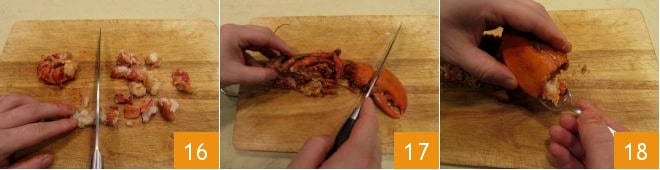 Coupez la chair de la langouste en morceaux 16, puis avec un couteau coupez les pinces 17 et prélevez la chair qu'elles contiennent avec une petite cuillère 18. Si vous le souhaitez, vous pouvez conserver la carapace pour la présentation finale.