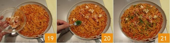 Ajoutez la chair 19, en en gardant une petite quantité de côté pour décorer le plat, et faites sauter les spaghetti avec le condiment pendant 2 minutes. Enfin, éteignez et ajoutez le persil finement haché aux spaghetti 20. Une fois prêts 21,