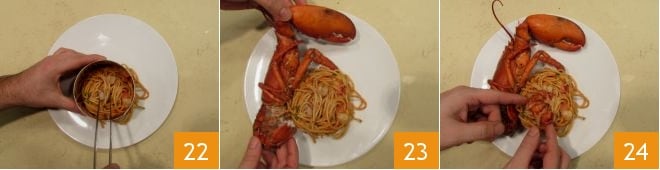 avec l'aide d'un emporte-pièce, disposez les spaghetti dans une assiette de service 22 : vous pouvez garnir avec la langouste 23 et la chair que vous avez mise de côté : vos spaghetti à la langouste en bellavista sont prêts à être servis 24 !