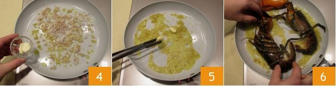 faites-la revenir dans une poêle antiadhésive avec l'huile et les gousses d'ail en chemise 4 ; quand l'ail sera doré, retirez-le avec des pinces de cuisine 5 et placez les langoustes dans la poêle 6, en les faisant sauter pendant 3-4 minutes.