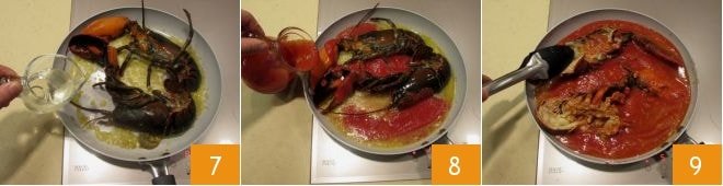 Déglacez avec le vin blanc 7 et laissez cuire à feu modéré pendant 2 minutes, puis ajoutez la purée de tomates 8 qui devra être assez épaisse. Faites cuire encore 4-5 minutes, en faisant réduire la sauce et en retournant de temps en temps les langoustes pour une cuisson uniforme 9.