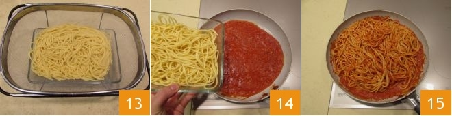 Égouttez les pâtes 13 et ajoutez-les à la sauce 14, en mélangeant bien avec une spatule ou avec une cuillère en bois 15.