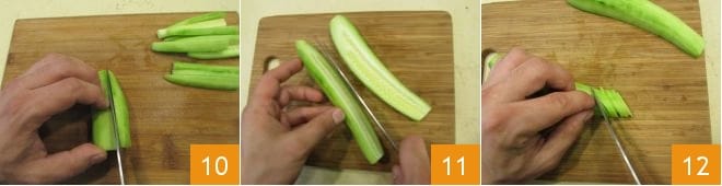 Prenez-en un et coupez-le en deux, puis dans le sens long du légume, en tranches de 6-7 mm 10. Ces tranches de concombre vous serviront pour la garniture du maki. Ensuite, prenez l'autre concombre et coupez-le en deux dans le sens de la longueur 11. Ensuite, coupez-le en tranches très fines dans le sens horizontal du légume, en les gardant unies pendant que vous les coupez 12. Ces dernières vous serviront à décorer la partie supérieure extérieure du maki.