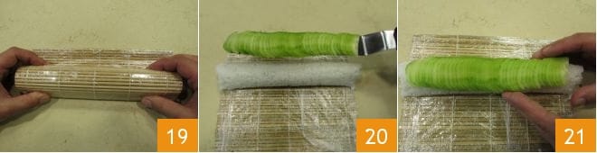Exercez une légère pression avec les mains en partant du centre du rouleau et en glissant vers l'extérieur pour le compacter 19. Ensuite, tirez le bord inférieur du tapis vers l'avant (comme sur l'image 18), en exerçant à nouveau une pression avec les mains du centre vers les bords. Lors de ces opérations, le tapis ne doit pas s'enrouler sur lui-même mais seulement faciliter la fermeture du rouleau. Répétez l'opération jusqu'à faire coïncider les deux extrémités du riz et obtenir ainsi votre maki. Déplacez maintenant les tranches de concombre écrasées sur le dessus du maki à l'aide d'une spatule pour les maintenir compactes 20. Disposez-les de manière à couvrir toute la surface du maki et ajustez-les éventuellement à l'aide de vos mains 21. Ensuite, procédez à nouveau à compacter le maki avec le tapis comme vous l'avez fait dans les étapes précédentes, pour compacter également la décoration.