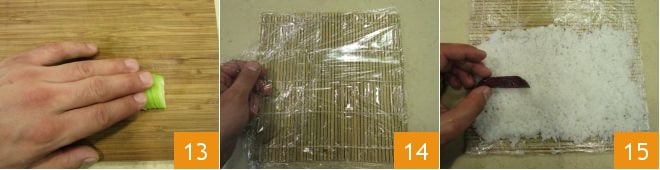 Exercez maintenant une pression avec les doigts sur les petites tranches de concombre encore unies pour les coucher de manière à créer une rangée oblique 13 et laissez-les de côté. Ces tranches vous serviront à décorer la partie supérieure du maki. À ce stade, prenez un tapis de bambou et posez-y une feuille de film alimentaire transparent 14. Humidifiez vos mains dans un bol d'eau légèrement acidulée pour éviter que le riz, qui sera assez collant, ne s'y colle. Posez sur le tapis de bambou environ 100 g de riz, dessinant un rectangle d'environ 10x15 cm. Disposez au centre les 3 lamelles de betterave 15.