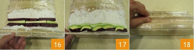 en les disposant l'une après l'autre ; à côté, créez une rangée de lamelles de concombre, puis à côté encore une de betterave 16, de manière à créer une alternance de couleurs. Enfin, au-dessus d'elles, déposez celles d'avocat 17. Vous pouvez maintenant réaliser le maki : attrapez le bord inférieur du tapis de bambou, soulevez-le pour le porter vers le centre 18.