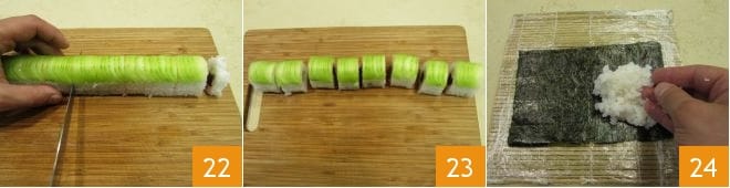 Ensuite, posez le maki sur une planche à découper, affinez-le en retaillant les extrémités sans décoration si nécessaire, et coupez-le en deux 22. Ensuite, divisez-le de manière à obtenir 8 pièces 23. Ensuite, procédez avec la deuxième préparation. Prenez à nouveau le tapis de bambou et tapissez-le d'une feuille de film plastique transparent ; posez-y une feuille d'algue nori. Répartissez le riz sur l'algue en laissant environ 2 cm d'algue libre sur le côté supérieur 24.