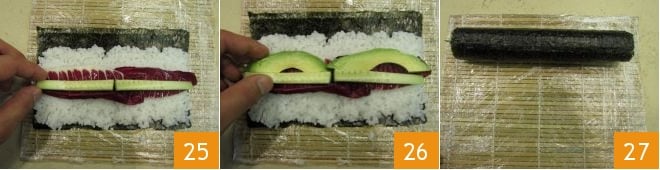 Disposez au centre une feuille de radicchio coupée en deux, par-dessus déposez une rangée de tranches de concombre 25 et à côté une d'avocat 26. Roulez ensuite délicatement le tapis de bambou comme indiqué dans les étapes précédentes pour compacter le maki 27.