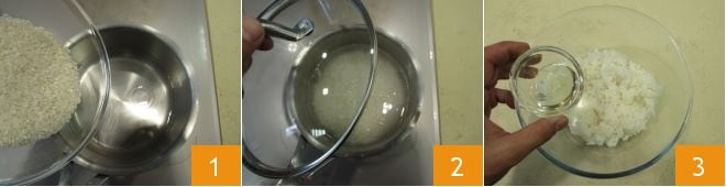 Pour préparer le sushi végétarien, commencez par la cuisson du riz. Prenez une casserole à bords hauts et versez-y l'eau et le riz 1. Couvrez avec le couvercle et portez à ébullition 2. Quand l'eau bout, baissez le feu et laissez cuire à feu doux pendant environ 15 minutes. Ne mélangez pas le riz. Lorsqu'il est cuit, transférez le riz dans un bol et ajoutez le vinaigre 3.