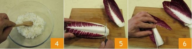 Remuez délicatement le riz en mélangeant avec une cuillère ou une spatule en bois jusqu'à ce qu'il soit à température ambiante (vous pouvez ventiler simultanément avec un petit éventail ou une assiette en plastique pour refroidir et faire évaporer le vinaigre plus rapidement) 4 et mettez-le de côté. Ensuite, consacrez-vous aux légumes. Rincez soigneusement les légumes et procédez à la préparation du radicchio : retirez la partie finale de la tête 5, puis détachez les feuilles et enlevez la côte centrale blanche de chacune 6. Replacez les feuilles de radicchio ainsi obtenues dans un petit bol et mettez-les de côté.