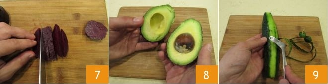 Puis prenez la betterave : coupez-la en fines tranches de 6-7 mm 7 et mettez-la de côté. Passez à l'avocat : divisez-le en deux, retirez le noyau intérieur 8 puis coupez-le en petits morceaux d'environ 6-7 millimètres. Enfin, prenez les concombres, équeutez-les et enlevez la peau avec un épluche-légumes 9.