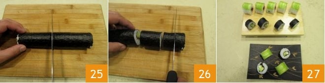 Enfin, retaillez les extrémités si nécessaire et coupez le maki en deux 28, puis chaque moitié en morceaux d'environ 2 cm d'épaisseur 29. Votre sushi végétarien est prêt à être dégusté 30 !