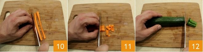 coupez-les en fines lamelles 10 puis en dés d'environ 5 mm 11. Coupez les extrémités des courgettes 12,