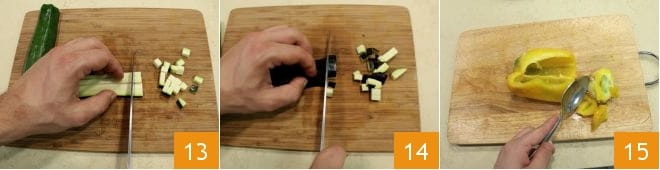coupez-les en dés toujours de 5 mm 13 et répétez la même opération pour les aubergines 14. Prenez les poivrons et éliminez la partie supérieure, puis avec un couteau retirez les graines qui se trouvent à l'intérieur 15.