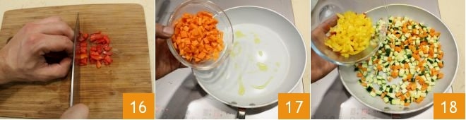 Réduisez les poivrons en fines lamelles, puis en dés de 5 mm 16. Lorsque tous les légumes seront nettoyés, placez une grande poêle antiadhésive sur le feu avec un filet d'huile. Faites cuire les carottes pendant 3 minutes 17 puis ajoutez les courgettes et les poivrons 18.
