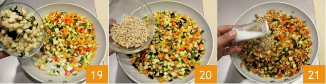 cuisez pendant encore 5 minutes puis ajoutez les aubergines 19 avec les pignons de pin 20. Faites sauter pendant encore 4-5 minutes. Lorsque les légumes seront cuits, ajoutez du sel et du poivre à votre goût 21; éteignez et mettez de côté.