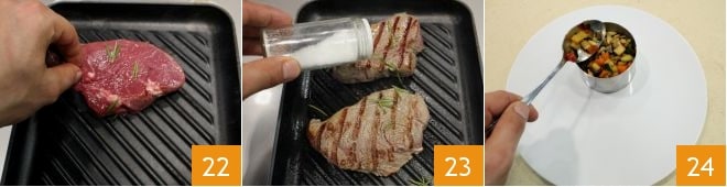 Une fois que la viande sera bien infusée, faites-la saisir sur un gril très chaud pendant 2-3 minutes de chaque côté 22, afin qu'elle reste tendre et rosée à l'intérieur : tournez une seule fois avec des pinces ou une spatule pour une cuisson uniforme et à la fin de la cuisson, ajustez le sel 23. Lorsque la viande sera prête, dressez la caponatina sur une assiette de service à l'aide d'un emporte-pièce de 10 cm de diamètre 24.