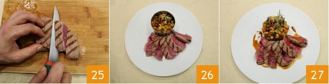 Coupez la viande en 4-5 tranches de 2 cm d'épaisseur 25, en les disposant sur l'assiette de service 26; terminez en retirant l'emporte-pièce et en versant un filet de réduction de sauce teriyaki sur la viande et, si vous le souhaitez, le sommet d'une branche de romarin : votre tranche de bœuf avec réduction de sauce teriyaki et caponatina est prête 24.