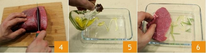 coupez la viande en 4 morceaux égaux de 130 g chacun 4. Dans un plat à part, versez 10 g d'huile 5, ajoutez une partie des aiguilles de romarin et déposez ensuite la viande 6;