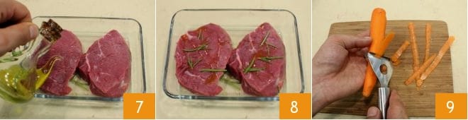 recouvrez le tout avec le reste d'huile 7 et avec les aiguilles de romarin que vous avez conservées, en les répartissant sur la viande. Laissez bien infuser la viande pendant 5-10 minutes et entre-temps, préparez la caponatina 8. Lavez tous les légumes sous un abondant filet d'eau fraîche courante ; nettoyez les carottes en éliminant la peau 9,
