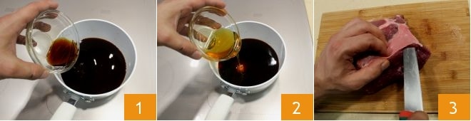 Pour réaliser la tranche de bœuf avec réduction de sauce teriyaki et caponatina, commencez par la préparation de la sauce. Dans une petite casserole, versez la sauce teriyaki 1 et le miel 2. Faites cuire à feu très doux pendant 30 minutes jusqu'à ce que la sauce soit réduite de moitié. Pendant ce temps, occupez-vous du nettoyage de la viande : avec un couteau, éliminez le gras et les nerfs 3, puis