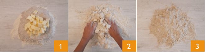 Pour réaliser la tarte au sarrasin, commencez par préparer la pâte sablée : disposez la farine 00 et celle de sarrasin en fontaine sur un plan de travail, ajoutez le beurre froid en dés 1 et pétrissez rapidement à la main 2 pour obtenir un mélange sablé 3.