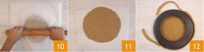 Après le temps de repos, étalez ¾ de la pâte entre 2 feuilles de papier sulfurisé 10 jusqu'à une épaisseur de 4 mm 11. Posez le moule à l'envers sur la pâte et découpez le contour pour obtenir un disque de la bonne taille 12.