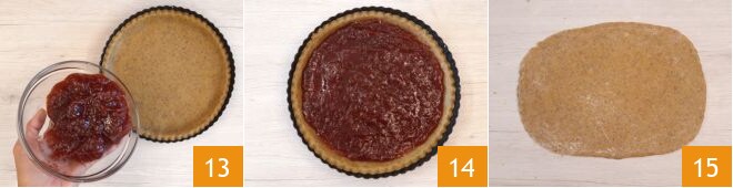 Tapissez le fond et les bords avec la pâte et versez la confiture de grenade à l'intérieur 13, en la nivelant uniformément 14. Maintenant, étalez le reste de la pâte à une épaisseur de 3 mm 15.