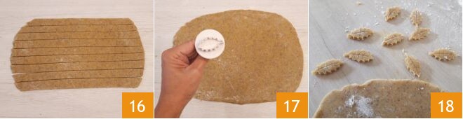 Coupez une partie de la pâte en bandes de 1 cm de large 16, puis utilisez un emporte-pièce en forme de feuille 17 pour découper des formes dans la pâte restante 18.