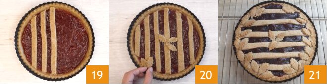 Posez les bandes de pâte sur la confiture 19, puis décorez le bord et le centre avec les petites feuilles 20. Faites cuire dans un four ventilé préchauffé à 180° pendant 35 minutes, en déplaçant la tarte sur la grille inférieure pendant les 5 dernières minutes. Une fois cuite, sortez votre tarte au sarrasin du four et laissez-la refroidir sur une grille avant de la déguster 21!
