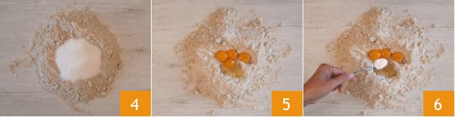 Ajoutez le sucre 4, les jaunes d'œufs, l'œuf entier 5 et la levure 6.