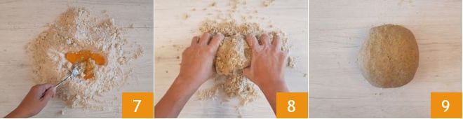 Cassez les œufs avec une fourchette pour les incorporer à la farine 7, puis pétrissez à la main 8 pour former une pâte lisse et homogène 9. Enveloppez la pâte dans du film plastique et laissez reposer au réfrigérateur pendant au moins 3 heures.