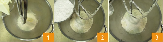 Pour préparer la tarte œil de bœuf, commencez par la Pâte sablée. Vous pouvez travailler avec le robot ou à la main dans le même ordre. Versez alors la farine et le beurre froid en morceaux dans le bol 1. Travaillez les ingrédients avec le crochet à feuille pendant quelques minutes avant d'ajouter le sucre glace 2 et le sel 3.