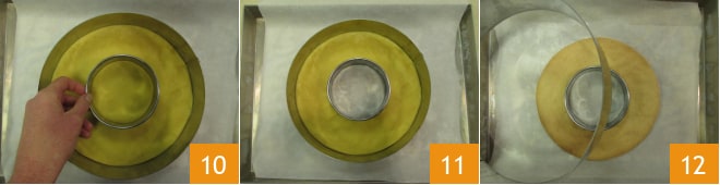 Dans l'une des deux bases, faites un trou avec un emporte-pièce plus petit de 10 cm de diamètre 10 et retirez la pâte au milieu mais pas le cercle qui servira à maintenir la forme 11. Passez alors à la cuisson des deux disques au four statique à 180° pendant 15 minutes ; retirez les formes lorsque les disques auront refroidi 12.
