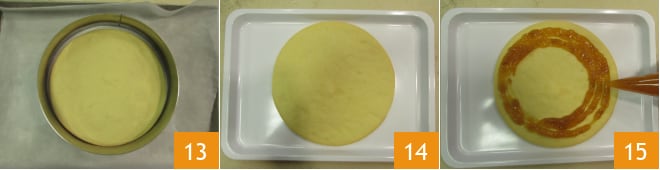 Faites de même avec l'autre disque 13. Lorsque les bases seront complètement refroidies, passez à la composition 14. Sur le disque fermé, versez la confiture d'abricots à étaler avec une cuillère ou avec une poche à douille 15.