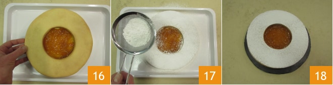 Posez le deuxième disque percé et appuyez légèrement avec les doigts pour bien le faire adhérer 16. Décorez la surface avec abondance de sucre glace, sans vous soucier s'il va sur la confiture car il sera ensuite absorbé 17 et votre tarte œil de bœuf est prête 18.