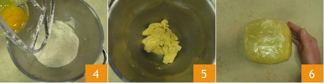Travaillez à nouveau les ingrédients pour obtenir une pâte sablée. Ajoutez également les œufs entiers et les jaunes 4. Continuez à laisser le robot travailler quelques instants jusqu'à obtenir une pâte homogène 5. Transférez sur le plan de travail, travaillez rapidement pour compacter puis formez un pâton, enveloppez-le dans un film plastique et laissez-le reposer au réfrigérateur pendant au moins une heure 6.