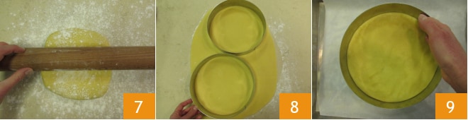 Après le temps de repos, abaissez la pâte sur un plan légèrement fariné à une épaisseur de ½ cm 7. Avec un cercle à pâtisserie, obtenez deux disques de 22 cm de diamètre 8 et transférez les formes sur deux plaques recouvertes de papier sulfurisé 9.