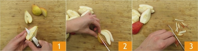 Pour préparer la tarte aux poires et cannelle, commencez par la confiture qui servira à la garnir. Lavez bien les deux types de poires, coupez-les en quartiers et retirez le cœur central 1, puis coupez-les en tranches d'environ 0,5 cm d'épaisseur 2 et coupez-les à nouveau en julienne pour obtenir des bâtonnets.