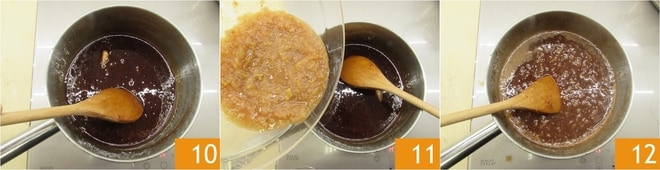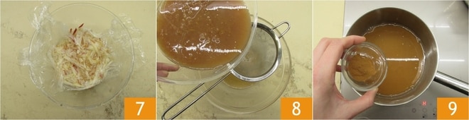 Transférez les poires dans un bol, couvrez-les avec du film plastique en contact 7 et laissez refroidir. Ensuite, placez au réfrigérateur pendant 8 heures. Après ce temps, reprenez les poires du réfrigérateur et filtrez-les afin de séparer les fruits de l'eau de végétation 8 que vous verserez dans une autre petite casserole. Chauffez à feu modéré et ajoutez la cannelle 9.