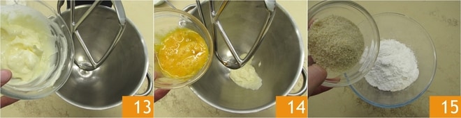 Préparez également la pâte sablée. Amenez le beurre à une température de 25° en vous aidant d'un micro-ondes et transférez-le dans le bol d'un batteur sur socle 13. Ajoutez l'œuf préalablement battu 14. Maintenant, dans un autre bol, versez le sucre glace et la farine d'amandes 15.