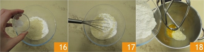 Ajoutez également le sel 16 et à l'aide d'un fouet, mélangez bien 17. Versez les poudres dans le bol du batteur sur socle 18.