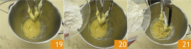 Actionnez maintenant la machine, avec le crochet feuilleté, et travaillez le mélange pendant quelques secondes 19. S'il reste des résidus sur le bord du bol, détachez le crochet et utilisez-le pour mélanger le mélange. Versez maintenant 63 g de farine de type 1 20 et mélangez rapidement jusqu'à ce qu'elle soit absorbée. Ensuite, ajoutez également les 179 g de farine restants 21.