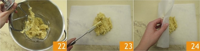 Travaillez rapidement la pâte sablée pour amalgamer le tout 22. Transférez la pâte sablée sur une feuille de papier sulfurisé de 30x40 cm 23, ne vous inquiétez pas si elle semble trop molle ou d'aspect peu homogène. La consistance est correcte lorsque, en la repliant sur elle-même, elle se détache du papier sans ajouter de farine 24.