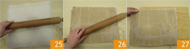 Donnez à la pâte sablée une forme rectangulaire, couvrez-la avec une autre feuille de papier sulfurisé de la même taille et étalez-la 26. Vous devez obtenir un rectangle parfait et une épaisseur assez fine 26. Placez sur un plateau ou une planche à découper 27, et transférez au réfrigérateur pendant 2-3 heures.