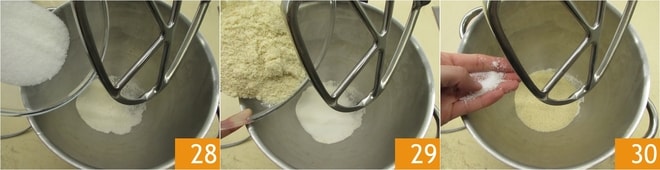 Préparez le streusel avec la technique du "sablage". Dans le bol du batteur sur socle, versez la farine de type 1, le sucre 28, la farine d'amandes 29 et une pincée de sel 30. Avec l'aide du crochet feuilleté, mélangez les poudres.