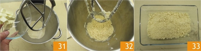Ensuite, ajoutez le beurre coupé en cubes 31. Travaillez à vitesse élevée jusqu'à obtenir un mélange granuleux 32. Arrêtez le batteur, transférez le streusel dans un bol 33 et placez au réfrigérateur pendant 30 minutes.