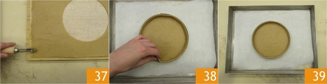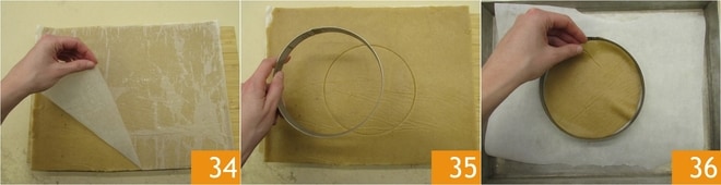 Après les temps de repos des différentes préparations, il ne vous reste plus qu'à assembler la tarte. Reprenez la pâte sablée et retirez la feuille de papier supérieur 34. Maintenant, en utilisant un cercle perforé de 17 cm, découpez la base de la tarte 35. Beurrez le cercle et placez-le sur une plaque à pâtisserie recouverte de papier sulfurisé et transférez à l'intérieur le disque de pâte sablée 35.