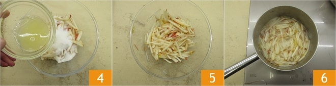 Transférez-les dans un bol, ajoutez le sucre et le jus de citron 4. Mélangez bien et laissez mariner pendant 15 minutes 5. Après ce temps, les poires auront libéré de l'eau, transférez donc le tout dans une petite casserole pour éviter une évaporation excessive. Portez à ébullition pendant quelques minutes 6.