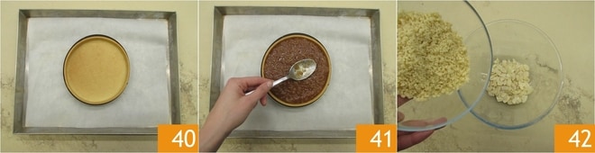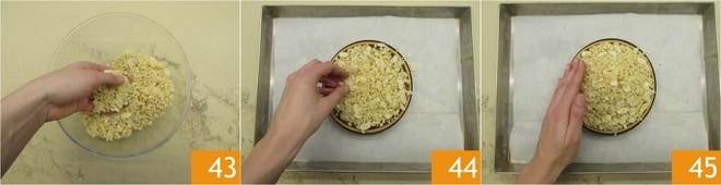 Passez maintenant à la cuisson. Faites cuire dans un four statique préchauffé à 165° pendant environ 18 minutes. Sortez-la du four 40 et laissez-la refroidir. Transférez la confiture à l'intérieur, vous devez obtenir une couche de 1 cm de hauteur. Nivelez bien avec le dos de la cuillère. Versez les amandes effilées dans un bol et ajoutez le streusel 42.